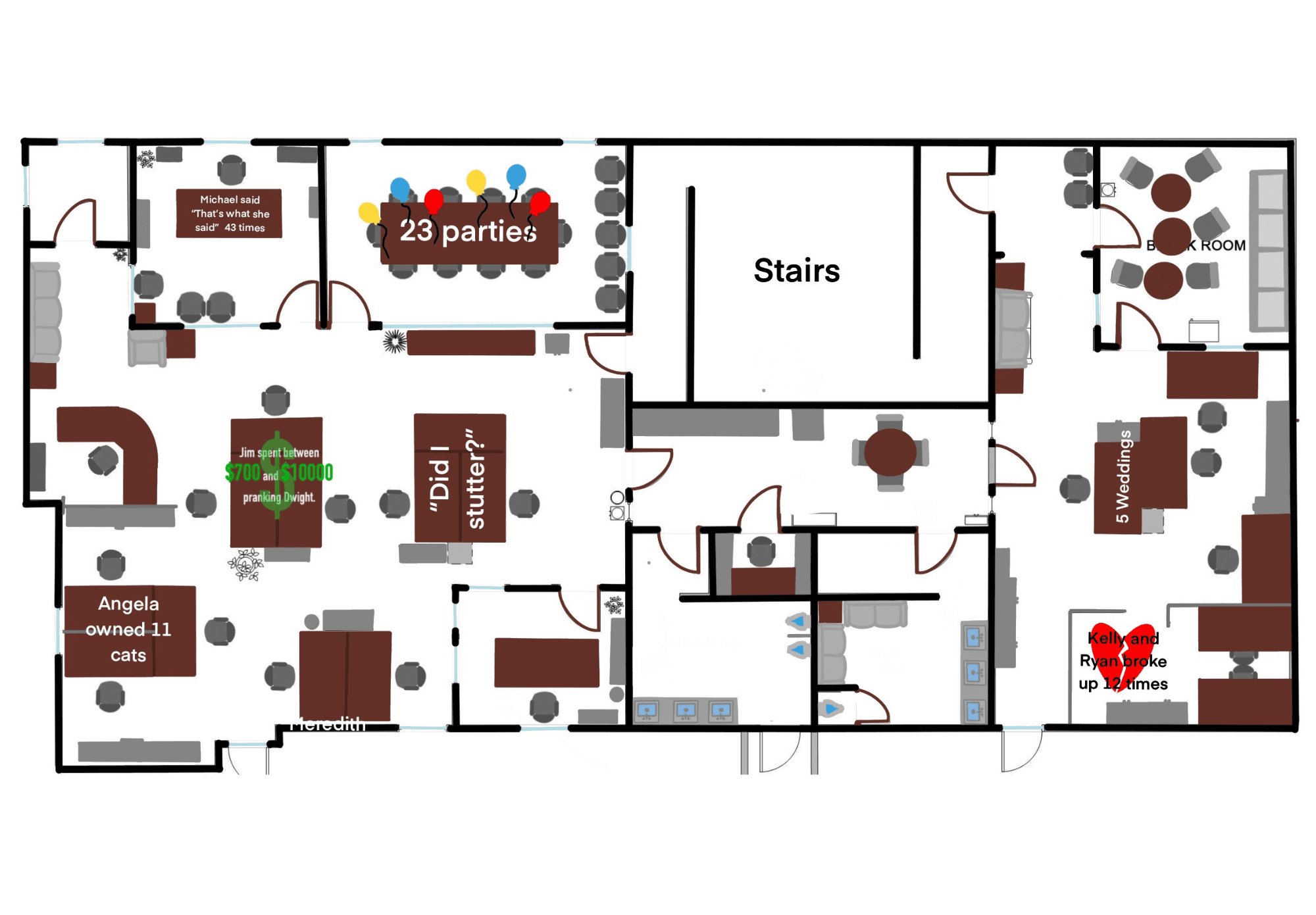 I wanted to ground the design in the world of the show, so I began by mapping out the floorplan of the Dunder Mifflin office. This process was both challenging and fun, as I pieced it together from stills, set references, and fan-made resources. I then annotated the floorplan with key moments and iconic scenes, creating a sense of narrative and movement within the space.